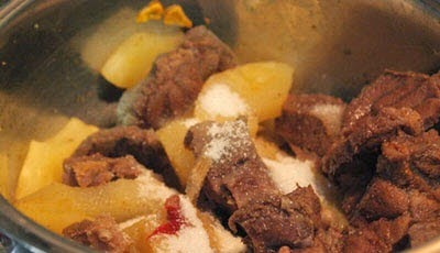 Step 4: Here is the important step to create one of Easy Vietnamese Recipes. Heat to oil, add minced garlic and fry until it is fragrant. Then, pour beef thigh (in step 2) into pan and fry about 5 minutes. Next, add more sliced pineapple. If you love spicy, you can add chili. Season with 2 tablespoons fish dauce + 1 tablespoon sugar + 1 teaspoon salt and cook until it boils. Finally, pour the broth into pan.